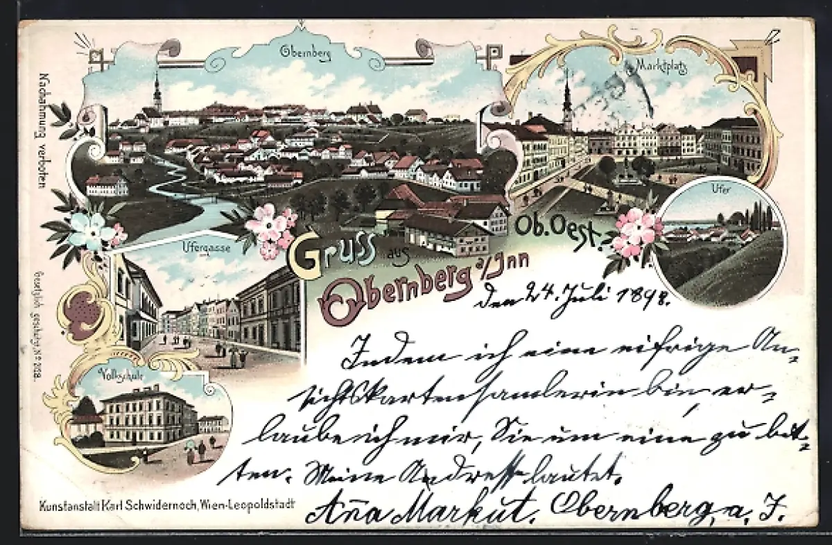 Lithographie Obernberg, Volksschule, Ufergasse, Marktplatz, Totalansicht