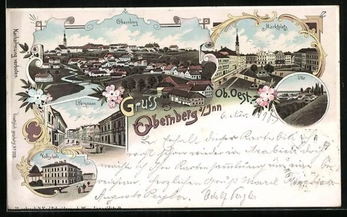 Lithographie Obernberg am Inn, Ufergasse, Volksschule, Ufer, Marktplatz