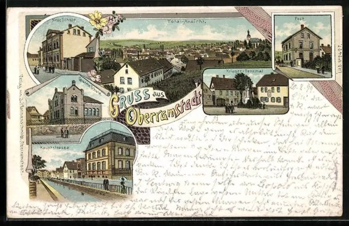 Lithographie Oberramstadt / Odenwald, Totalansicht, Neue Schule, Kriegerdenkmal und Post
