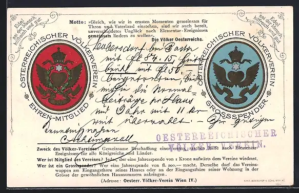 Lithographie Österreichischer Völkerverein, Abzeichen Ehren-Mitglied und Grossspender