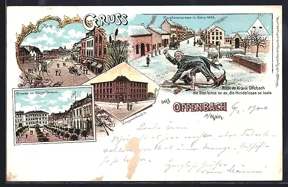 Lithographie Offenbach / Main, Aliceplatz mit Kriegerdenkmal, Markt, Kunstgewerbeschule, Hund