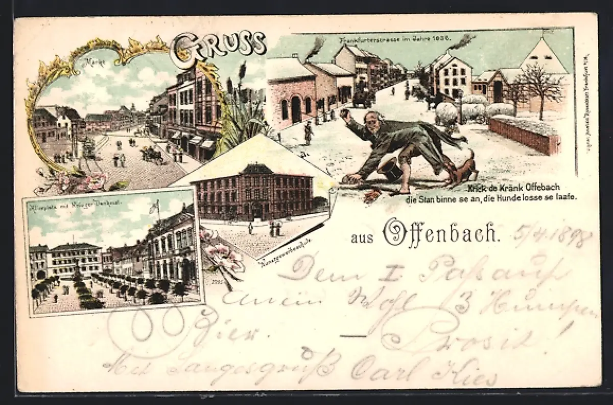 Lithographie Offenbach / Main, Markt, Aliceplatz mit Krieger-Denkmal, Kunstgewerbeschule