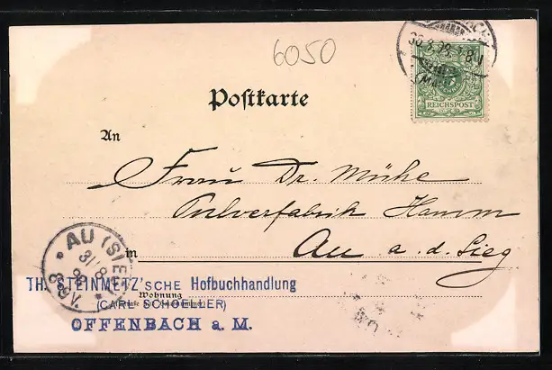 Personenbezogene Daten auf der Rückseite der Karte wurden durch blauen Textmarker unkenntlich gemacht. Die blauen Stellen sind auf die Vorderseite durchgeweicht und wirken sich negativ auf das Postkartenfoto aus