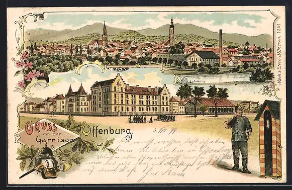 Lithographie Offenburg, Blick zur Kaserne, Soldat steht auf Wacht am Schilderhaus, Stadtpanorama