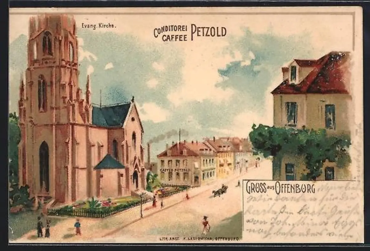 Lithographie Offenburg, Konditorei-Cafe Petzold und Evangelische Kirche