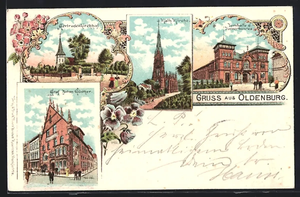 Lithographie Oldenburg / Gr., Graf Anton Günther-Haus, Kath. Kirche, Turnhalle des Turnerbundes
