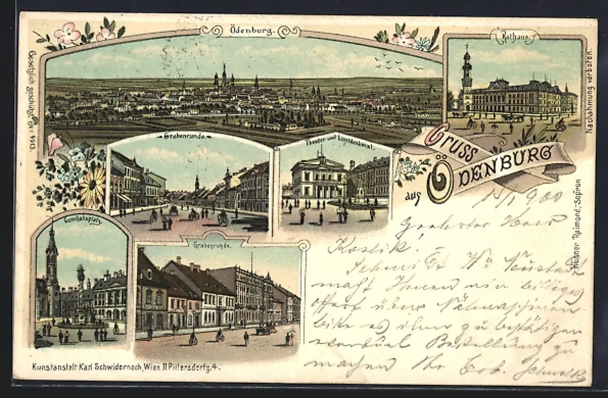 Lithographie Oldenburg, Theater und Listdenkmal, Grabenrunde, Rathaus