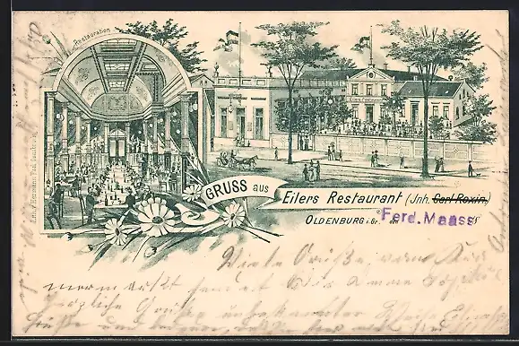 Lithographie Oldenburg i. Gr., Eiler`s Restaurant v. Carl Roxin, mit Innenansicht