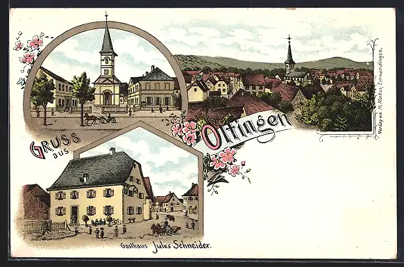 Lithographie Oltingen, Gasthaus Jules Schneider mit Strasse, Ortspartie mit Turmgebäude, Teilansicht