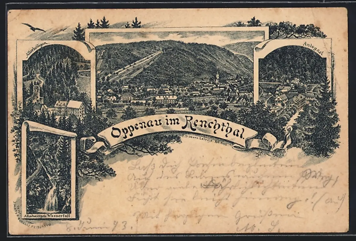 Lithographie Oppenau im Renchthal, Gesamtansicht, Allerheiligen-Wasserfall, Antogast