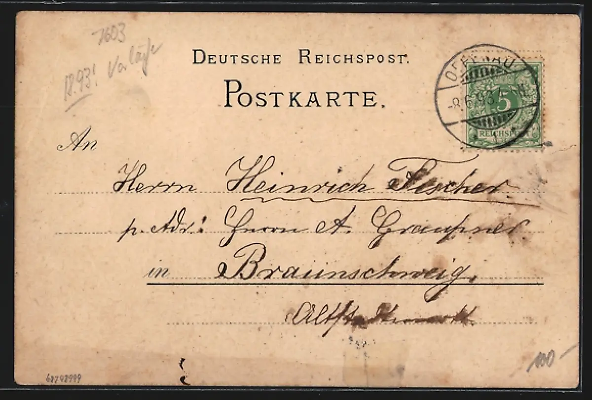Personenbezogene Daten auf der Rückseite der Karte wurden durch blauen Textmarker unkenntlich gemacht. Die blauen Stellen sind auf die Vorderseite durchgeweicht und wirken sich negativ auf das Postkartenfoto aus