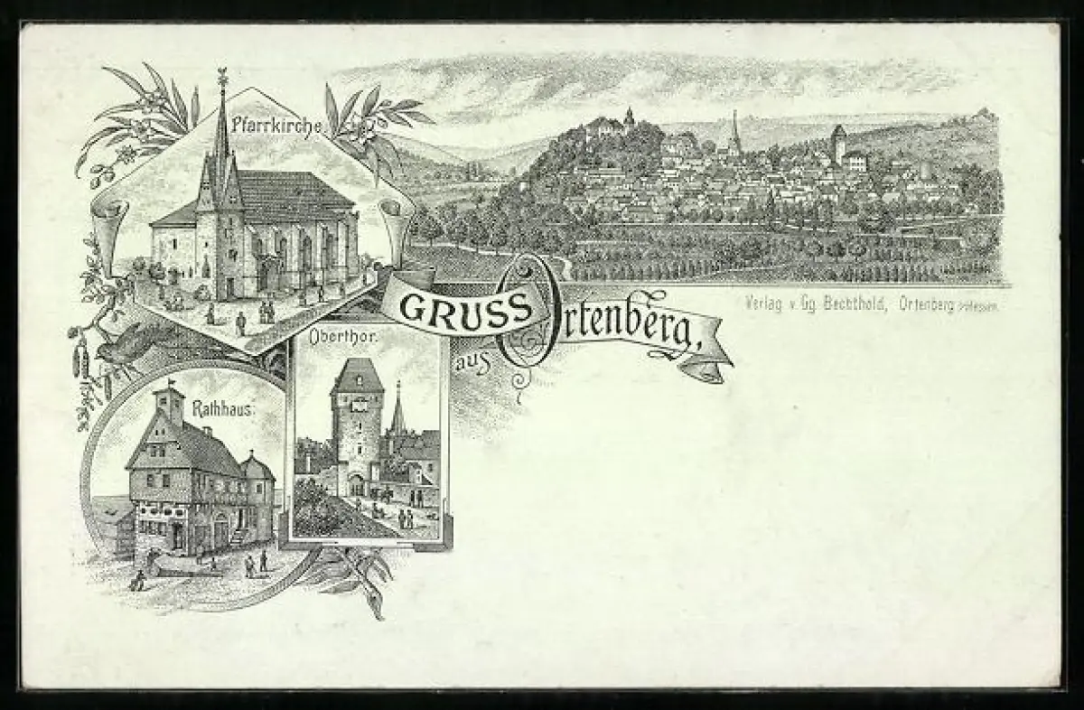 Lithographie Ortenberg / Hessen, Totalansicht, Pfarrkirche, Oberthor, Rathaus