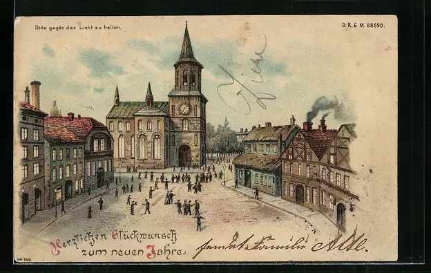Lithographie Ortspartie mit Kirche, Halt gegen das Licht: Neujahrsgruss