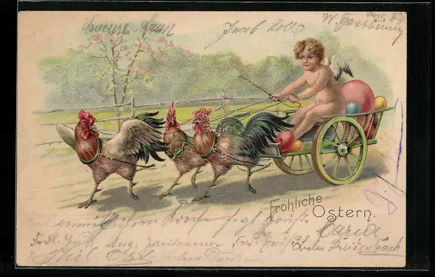 Lithographie Osterengel in einer mit Hähnen bespannten Kutsche