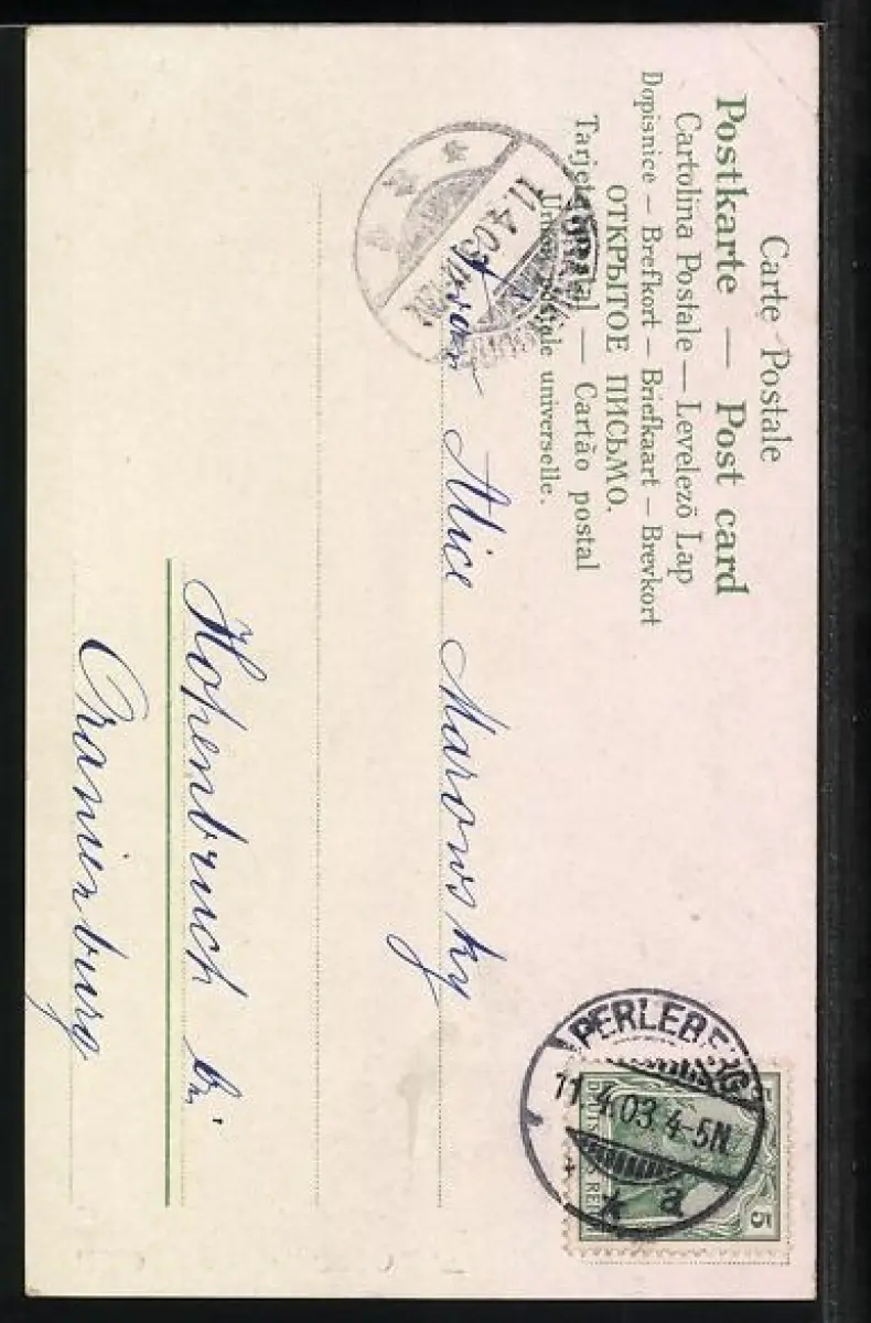 Personenbezogene Daten auf der Rückseite der Karte wurden durch blauen Textmarker unkenntlich gemacht. Die blauen Stellen sind auf die Vorderseite durchgeweicht und wirken sich negativ auf das Postkartenfoto aus