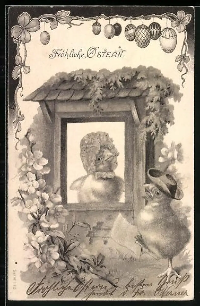 Lithographie Osterküken singt vor einem Fenster, Fröhliche Ostern