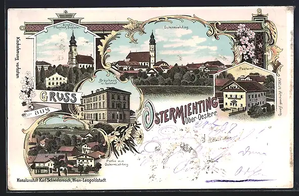 Lithographie Ostermiething, Bräuhaus und Gasthof, Schule, Pfarrhof, Postamt