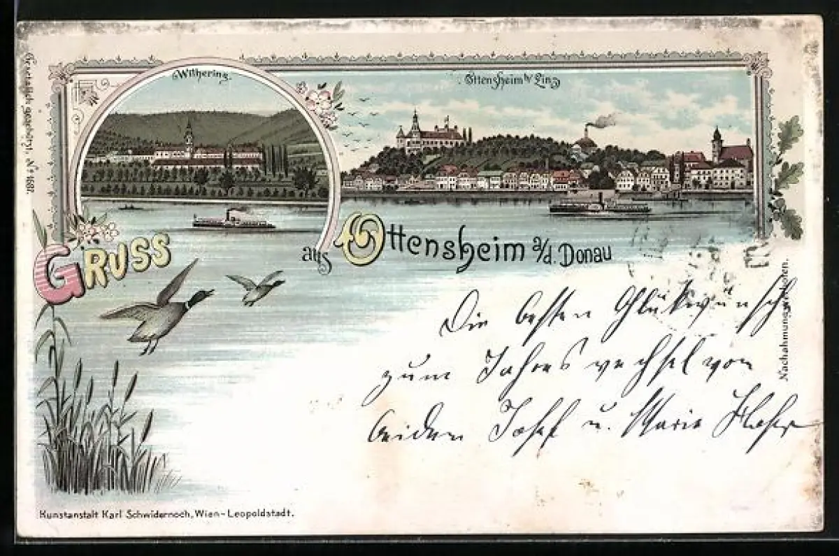 Lithographie Ottensheim a. d. Donau, Withering mit Dampfer, Gesamtansicht mit Dampfer