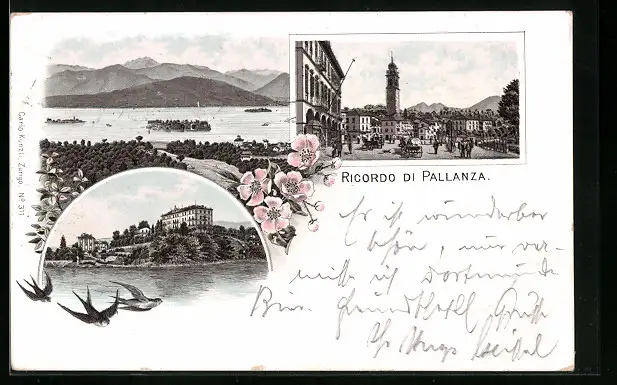 Lithographie Pallanza, Panorama mit Isole borromee & Strassenleben
