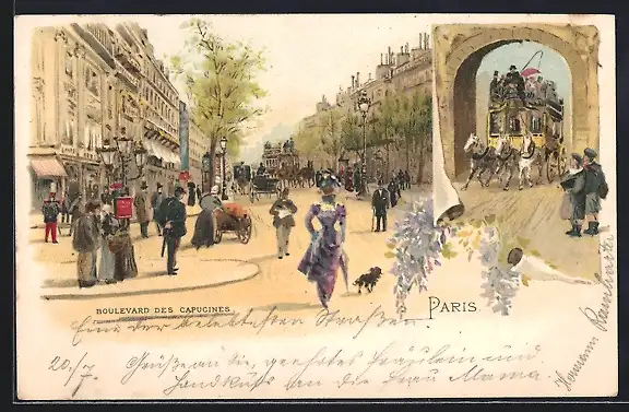 Lithographie Paris, Boulevard des Capucines, Pferdebus