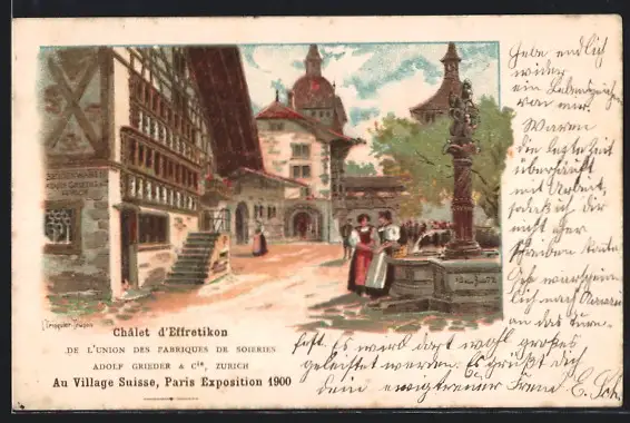 Lithographie Paris, Exposition universelle de 1900, Châlet d`Effrikon au Village Suisse