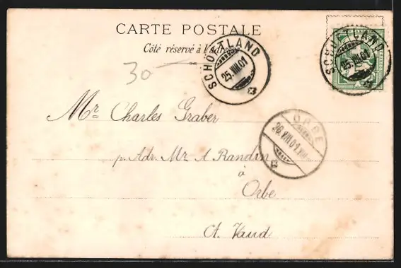Personenbezogene Daten auf der Rückseite der Karte wurden durch blauen Textmarker unkenntlich gemacht. Die blauen Stellen sind auf die Vorderseite durchgeweicht und wirken sich negativ auf das Postkartenfoto aus