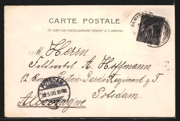 Personenbezogene Daten auf der Rückseite der Karte wurden durch blauen Textmarker unkenntlich gemacht. Die blauen Stellen sind auf die Vorderseite durchgeweicht und wirken sich negativ auf das Postkartenfoto aus