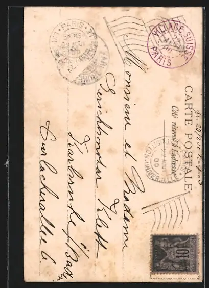 Personenbezogene Daten auf der Rückseite der Karte wurden durch blauen Textmarker unkenntlich gemacht. Die blauen Stellen sind auf die Vorderseite durchgeweicht und wirken sich negativ auf das Postkartenfoto aus