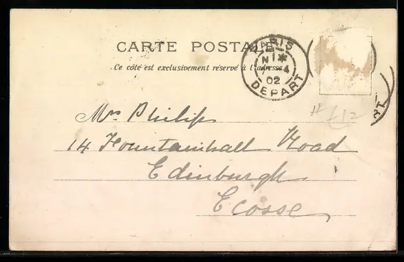 gelaufen 1902, Briefmarke entfernt, rückseitig Oberflächenschaden, Bugspur li. oben, guter Zustand