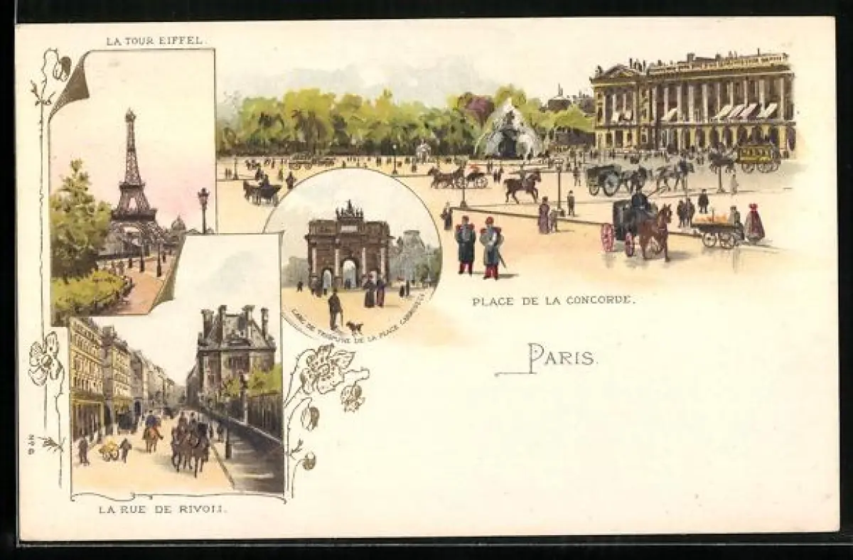 Lithographie Paris, Place de la Concorde, La Tour Eifel