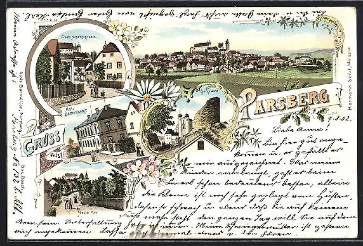 Lithographie Parsberg / Neumarkt, Kgl. Bezirksamt, Burgruine, Neue Strasse, Zum Marktplatz