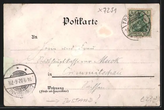 gelaufen 1902, großflächige Abriebspuren, geklebter Einriss re. mittig, Eckknicke, Bugspur li. oben