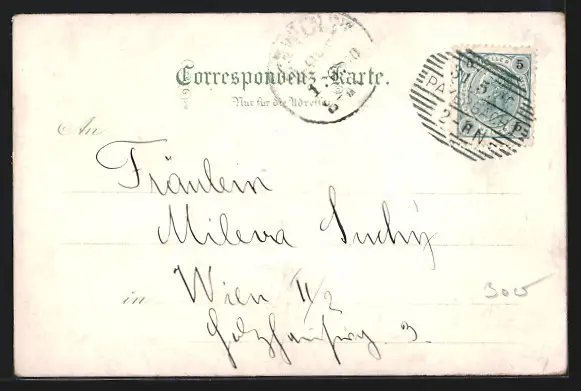 Personenbezogene Daten auf der Rückseite der Karte wurden durch blauen Textmarker unkenntlich gemacht. Die blauen Stellen sind auf die Vorderseite durchgeweicht und wirken sich negativ auf das Postkartenfoto aus