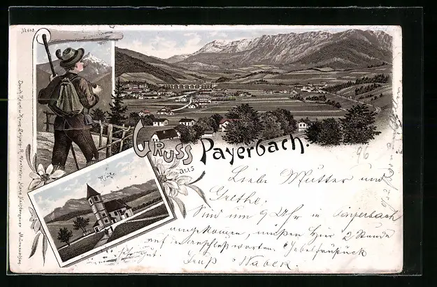 Lithographie Payerbach, Ortsansicht mit Kirche und Wanderer