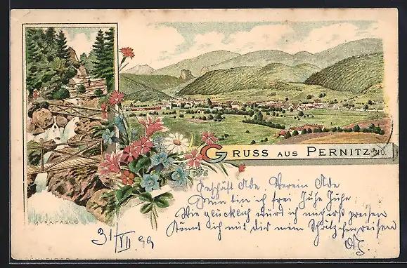 Lithographie Pernitz, An den Myrafällen, Panoramablick auf die Ortschaft