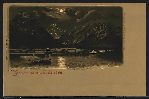 Lithographie Pertisau am Achensee, nächtlicher Blick auf den Ort, Dampfer auf dem See