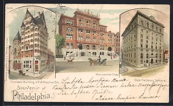 Lithographie Philadelphia, PA, Provident Building 4th & Chestnut Sts., Mercantile Club, Odd Fellows Temple