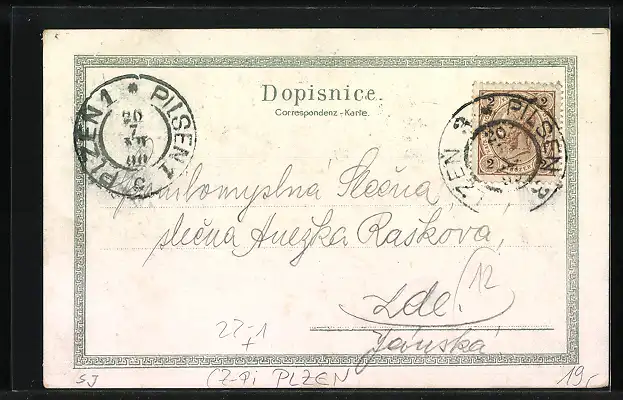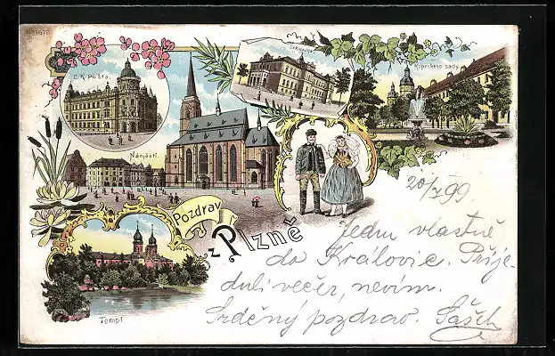 Lithographie Pilsen, Synagoge, Ringplatz, Paar in Tracht