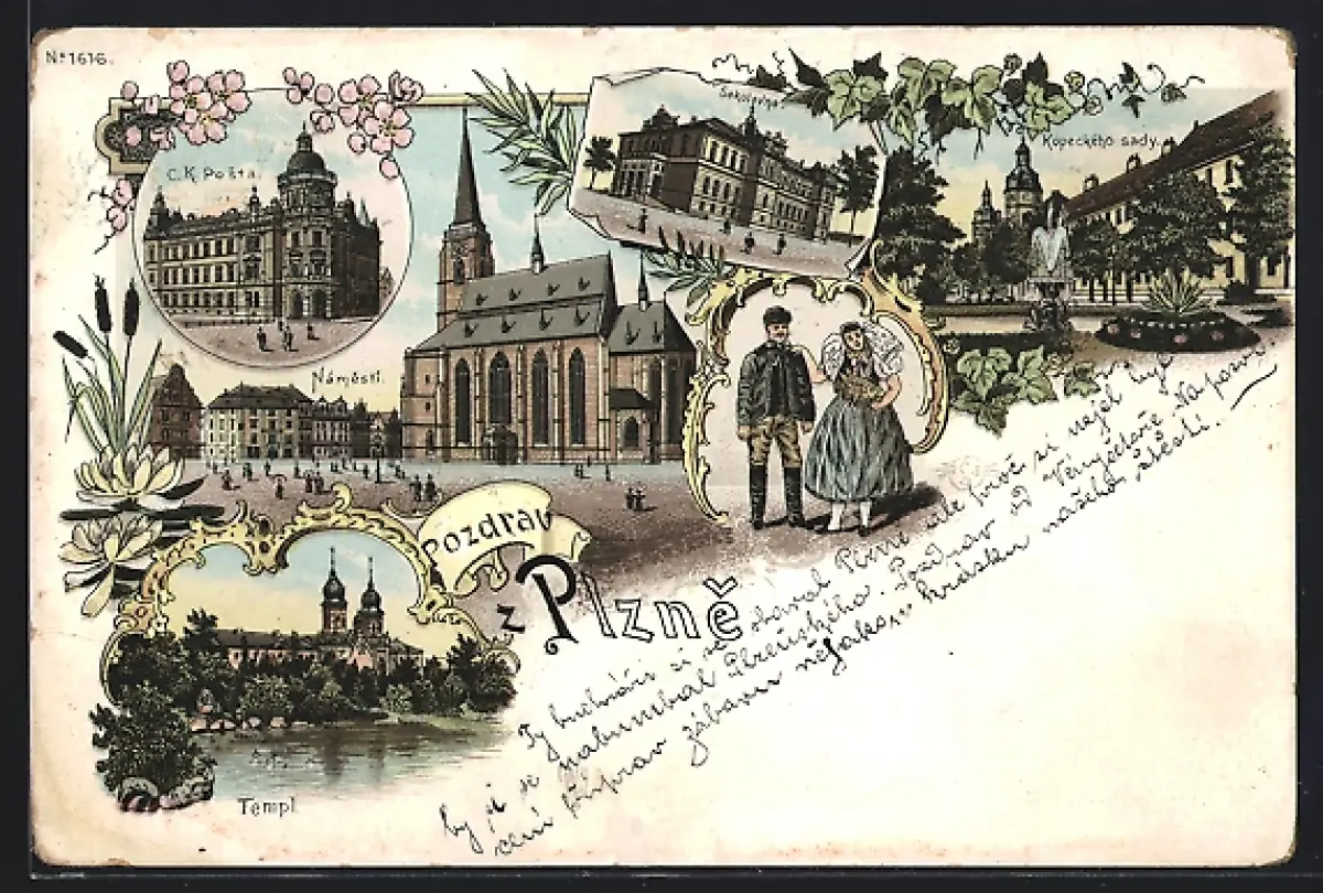 Lithographie Pilsen, Synagoge, Ringplatz, Paar in Tracht