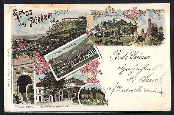 Lithographie Pitten, Blick über den Ort, Bahnhof, Geschäftshaus Josef Glöckler