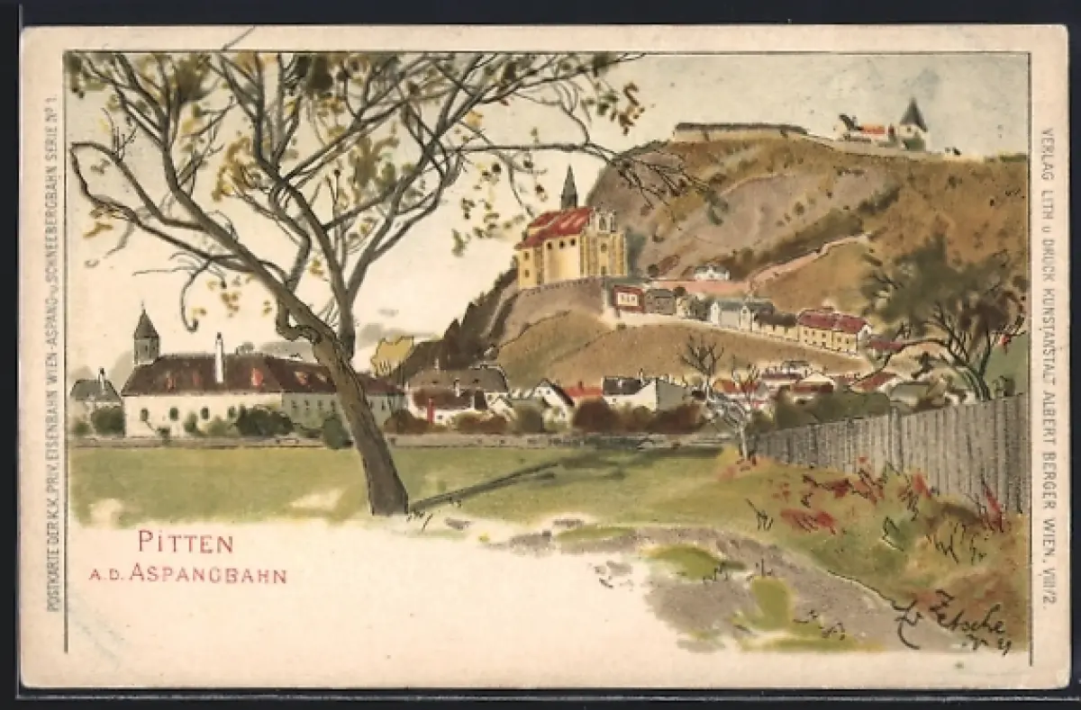 Lithographie Pitten a. d. Aspangbahn, Ortspanorama mit Bergblick