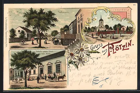 Lithographie Plötzin, Gasthof zum goldenen Stern, Inh. Gustav Kleist, Dorfstrasse