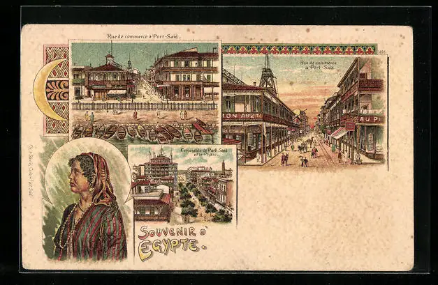 Lithographie Port-Said, Rue de commerce, Ensemble de Port-Said et le Phare