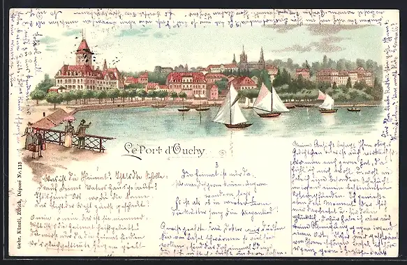 Lithographie Port d`Ouchy, Totalansicht, Segelboote