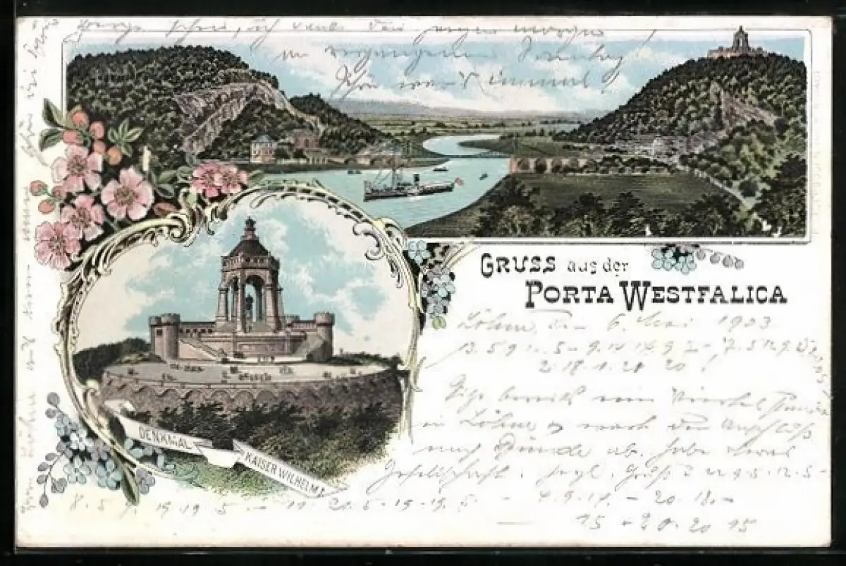Lithographie Porta Westfalica, Denkmal Wilhelm der Grosse, Panorama