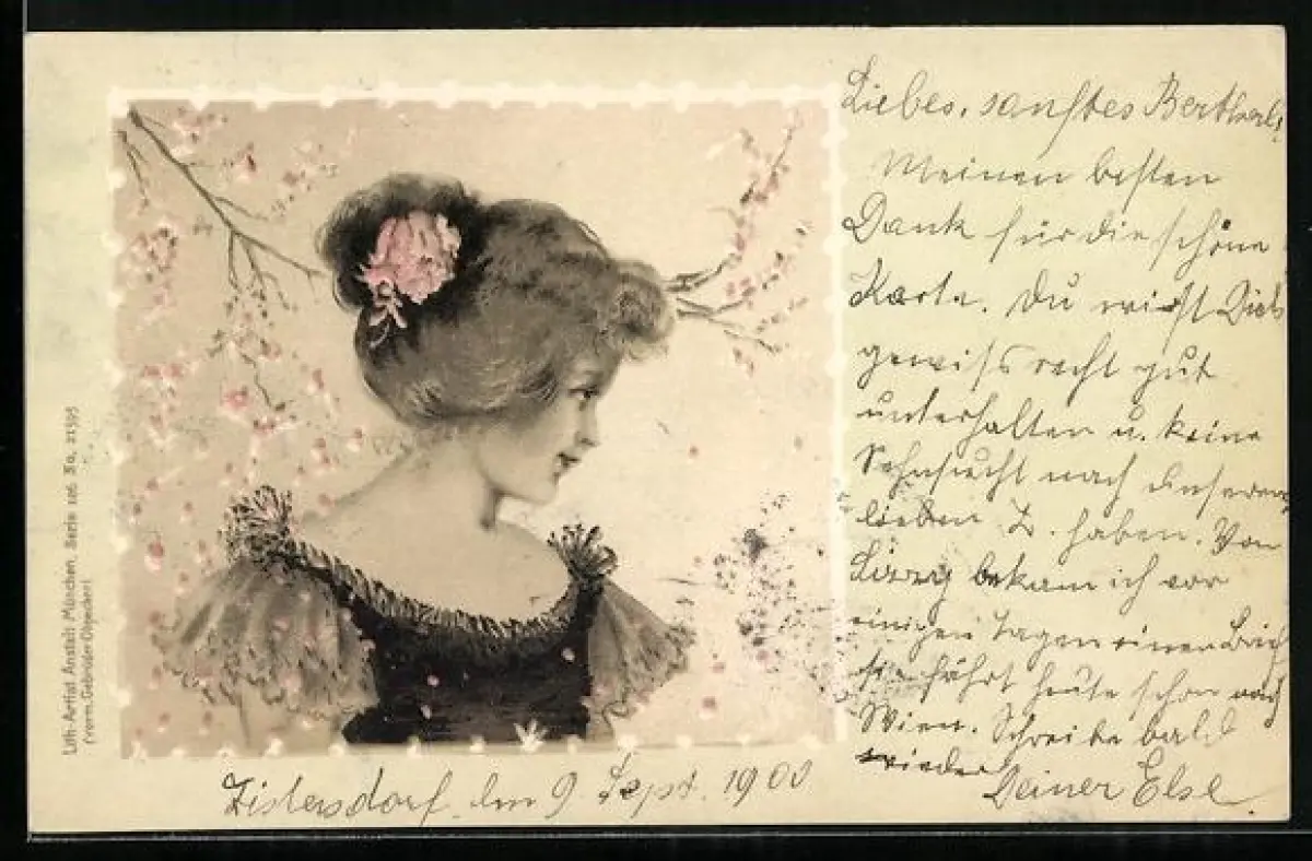 Lithographie Porträt einer Dame vor einem blühenden Baum, Jugendstil