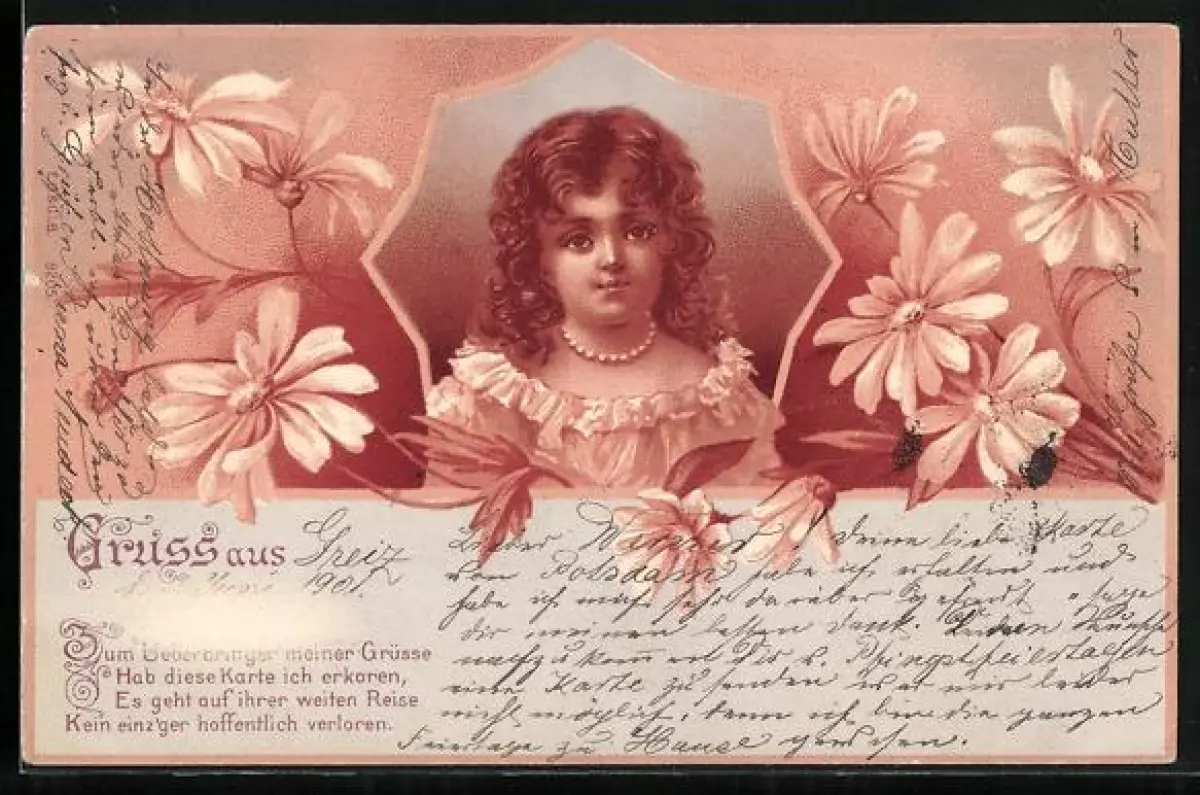 Lithographie Porträt eines Mädchens mit Margeriten, Zum Ueberbringer meiner Grüsse Hab diese Karte ich erkoren...