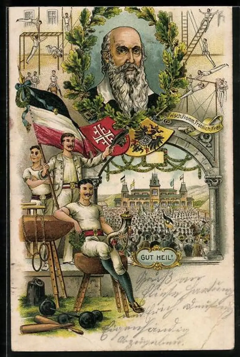 Lithographie Porträt von Turnvater Jahn mit Turnern und Reichsflagge