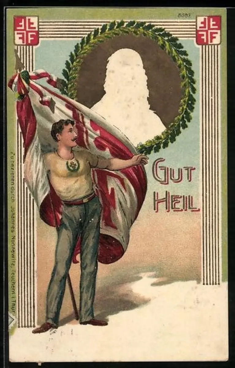 Lithographie Portrait vom Turnvater Jahn im Eichenkranz, Mann mit riesiger Fahne