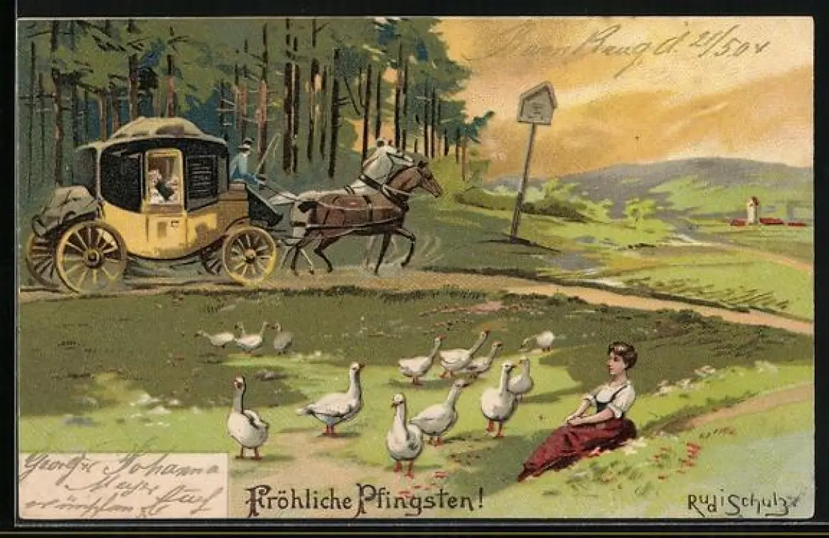 Lithographie Postkutsche unterwegs, Gänsehüterin, Pfingstgruss